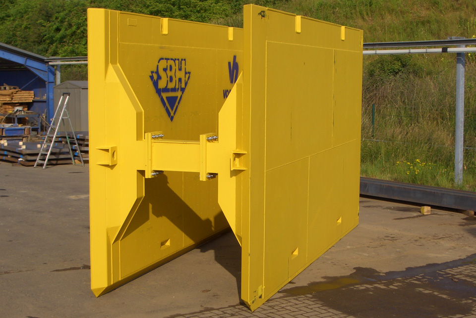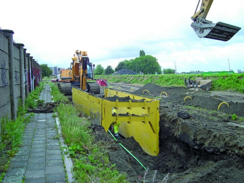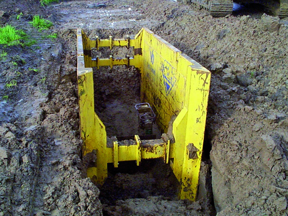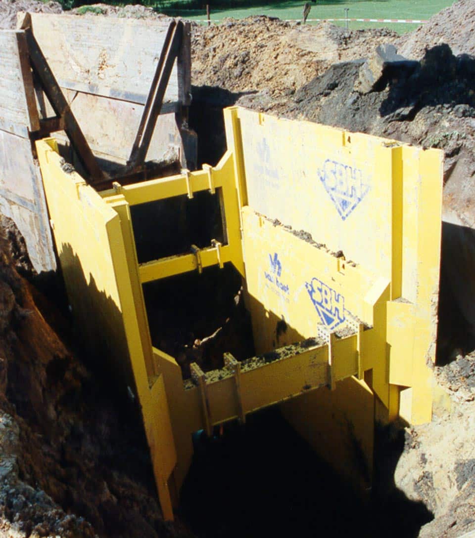 Il box a traino è stato concepito per canalizzazioni in zone aperte e con terreno compatto, assicurando l’area per la posa dei tubi. Ai lati frontali non viene è presente l’armatura: deve essere effettuato un scavo a scarpata. In fronte si effettua l’ulteriore scavo e il box a traino viene trainato attraverso il fossato scavato e posto nella nuova posizione utile. Nella parte posteriore è necessario compattare nuovamente il terreno.